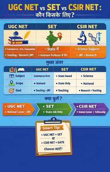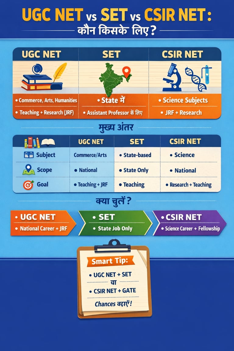 рдЕрдЧрд░ рдЖрдк India рдореЗрдВ teaching рдпрд╛ research career plan рдХрд░ рд░рд╣реЗ рд╣реИрдВ, рддреЛ рдпреЗ рддреАрди exams рдмрд╛рд░-рдмрд╛рд░ рд╕реБрдирдиреЗ рдХреЛ рдорд┐рд▓рддреЗ рд╣реИрдВ: UGC NET, SET, рдФрд░ CSIR NET.